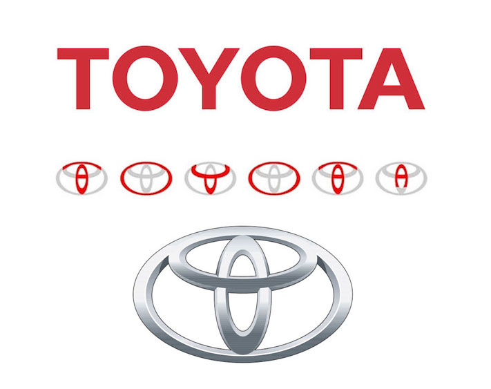 - Toyota: Het logo van Toyota bestaat uit alle letters van de naam TOYOTA
