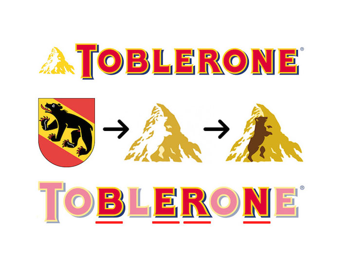 - Toblerone: De populaire chocoladerepen van Toblerone, bestaande uit driehoeken partjes, worden gemaakt in Zwitserland. Vandaar de berg Matterhorn in het logo. Maar als je goed naar de berg kijkt, zie je nog een boodschap. In de linkerhelft staat een beer afgebeeld, die de unieke honingsmaak symboliseert.